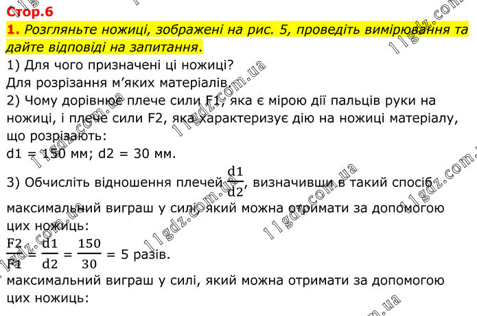 1. Розгляньте ножиці, зображені на рис. 5, проведіть вимірювання та дайте відповіді на запитання. 1) Для чого призначені ці ножиці? Для розрізання м’яких матеріалів. 2) Чому дорівнює плече сили F1, яка є мірою дії пальців руки на ножиці, і плече сили F2, яка характеризує дію на ножиці матеріалу, що розрізають: d1 = 150 мм; d2 = 30 мм. 3) Обчисліть відношення плечей d1/d2, визначивши в такий спосіб максимальний виграш у силі, який можна отримати за допомогою цих ножиць: F2/F1 = d1/d2 = 150/30 = 5 разів. максимальний виграш у силі, який можна отримати за допомогою цих ножиць: