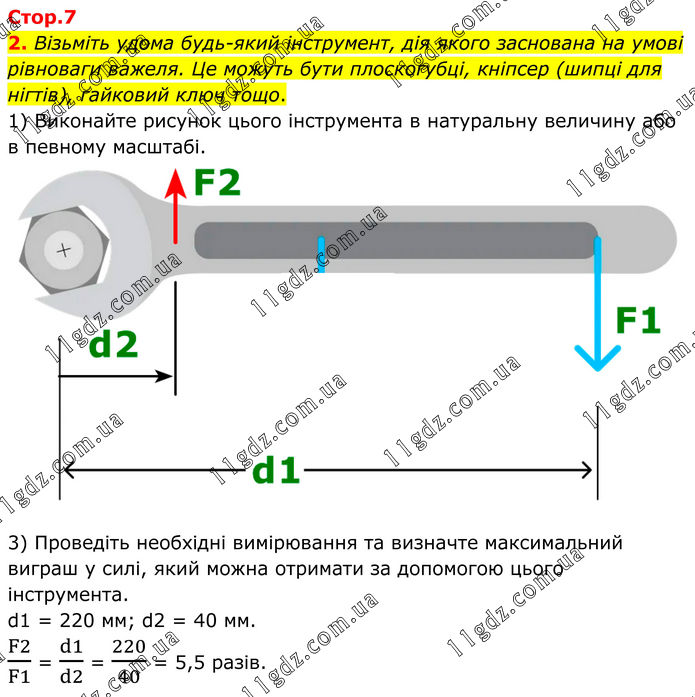 2. Візьміть удома будь-який інструмент, дія якого заснована на умові рівноваги важеля. Це можуть бути плоскогубці, кніпсер (шипці для нігтів), гайковий ключ тощо. 1) Виконайте рисунок цього інструмента в натуральну величину або в певному масштабі. 3) Проведіть необхідні вимірювання та визначте максимальний виграш у силі, який можна отримати за допомогою цього інструмента. d1 = 220 мм; d2 = 40 мм. F2/F1 = d1/d2 = 220/40 = 5,5 разів.