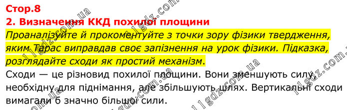 2. Визначення ККД похилої площини Проаналізуйте й прокоментуйте з точки зору фізики твердження, яким Тарас виправдав своє запізнення на урок фізики. Підказка, розглядайте сходи як простий механізм. Сходи — це різновид похилої площини. Вони зменшують силу, необхідну для піднімання, але збільшують шлях. Вертикальні сходи вимагали б значно більшої сили.