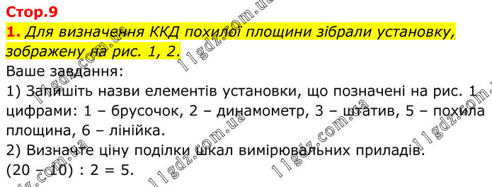 1. Для визначення ККД похилої площини зібрали установку, зображену на рис. 1, 2. Ваше завдання: 1) Запишіть назви елементів установки, що позначені на рис. 1 цифрами: 1 – брусочок, 2 – динамометр, 3 – штатив, 5 – похила площина, 6 – лінійка. 2) Визначте ціну поділки шкал вимірювальних приладів. (20 – 10) : 2 = 5.