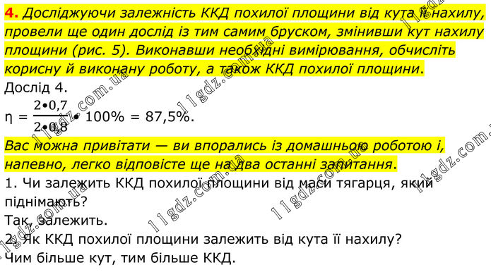 4. Досліджуючи залежність ККД похилої площини від кута її нахилу, провели ще один дослід із тим самим бруском, змінивши кут нахилу площини (рис. 5). Виконавши необхідні вимірювання, обчисліть корисну й виконану роботу, а також ККД похилої площини. Дослід 4. η = (2•0,7)/(2•0,8) • 100% = 87,5%. Вас можна привітати — ви впорались із домашньою роботою і, напевно, легко відповісте ще на два останні запитання. 1. Чи залежить ККД похилої площини від маси тягарця, який піднімають? Так, залежить. 2. Як ККД похилої площини залежить від кута її нахилу? Чим більше кут, тим більше ККД.