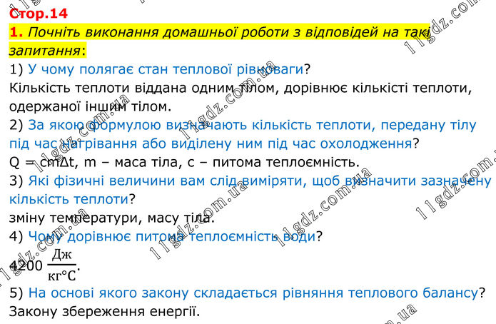1. Почніть виконання домашньої роботи з відповідей на такі запитання: 1) У чому полягає стан теплової рівноваги? Кількість теплоти віддана одним тілом, дорівнює кількісті теплоти, одержаної іншим тілом. 2) За якою формулою визначають кількість теплоти, передану тілу під час нагрівання або виділену ним під час охолодження? Q = cmΔt, m – маса тіла, с – питома теплоємність. 3) Які фізичні величини вам слід виміряти, щоб визначити зазначену кількість теплоти? зміну температури, масу тіла. 4) Чому дорівнює питома теплоємність води? 4200 Дж/(кг°C). 5) На основі якого закону складається рівняння теплового балансу? Закону збереження енергії.