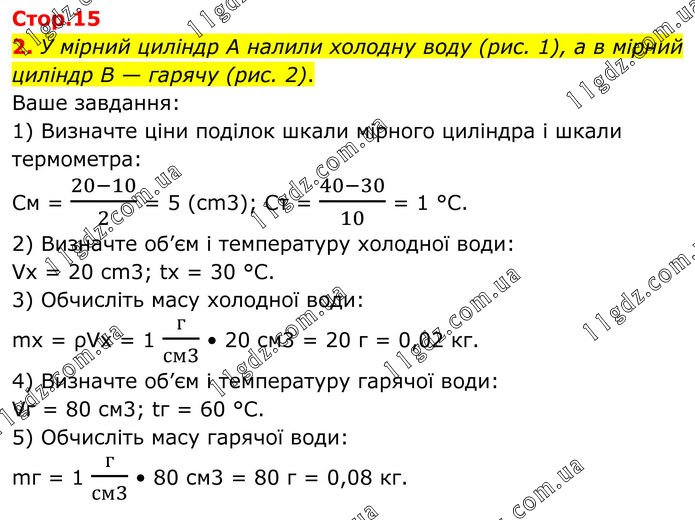 2. У мірний циліндр А налили холодну воду (рис. 1), а в мірний циліндр В — гарячу (рис. 2). Ваше завдання: 1) Визначте ціни поділок шкали мірного циліндра і шкали термометра: См = (20-10)/2 = 5 (cm3); Cт = (40-30)/10 = 1 °С. 2) Визначте об’єм і температуру холодної води: Vx = 20 cm3; tx = 30 °С. 3) Обчисліть масу холодної води: mx = ρVx = 1 г/см3 • 20 см3 = 20 г = 0,02 кг. 4) Визначте об’єм і температуру гарячої води: Vг = 80 см3; tг = 60 °С. 5) Обчисліть масу гарячої води: mг = 1 г/см3 • 80 см3 = 80 г = 0,08 кг.