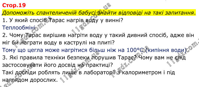 Допоможіть спантеличеній бабусі знайти відповіді на такі запитання. 1. У який спосіб Тарас нагрів воду у винні? Теплообміні 2. Чому Тарас вирішив нагріти воду у такий дивний спосіб, адже він міг би награти воду в каструлі на плиті? Тому що цегла може нагрітися більш ніж на 100°С (кипіння води) 3. Які правила техніки безпеки порушив Тарас? Чому вам не слід застосовувати його досвід на практиці? Такі досліди роблять лише в лабораторії з калориметром і під наглядом дорослих.