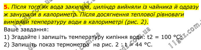 5. Після того як вода закипіла, циліндр вийняли із чайника й одразу ж занурили в калориметр. Після досягнення теплової рівноваги виміряли температуру води в калориметрі (рис. 2). Ваше завдання: 1) Згадайте і запишіть температуру кипіння води: t2 = 100 °C; 2) Запишіть показ термометра на рис. 2 : t = 44 °C.