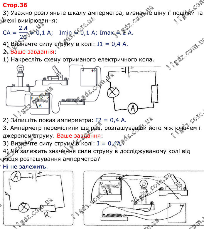 3) Уважно розгляньте шкалу амперметра, визначте ціну її поділки та межі вимірювання: СА = (2 A)/20 = 0,1 А; Imin = 0,1 A; Imax = 2 A. 4) Визначте силу струму в колі: I1 = 0,4 A. 2. Ваше завдання: 1) Накресліть схему отриманого електричного кола. 2) Запишіть показ амперметра: I2 = 0,4 A. 3. Амперметр перемістили ще раз, розташувавши його між ключем і джерелом струму. Ваше завдання: 3) Визначте силу струму в колі: I = 0,4A. 4) Чи залежить значення сили струму в досліджуваному колі від місця розташування амперметра? Ні не залежить.