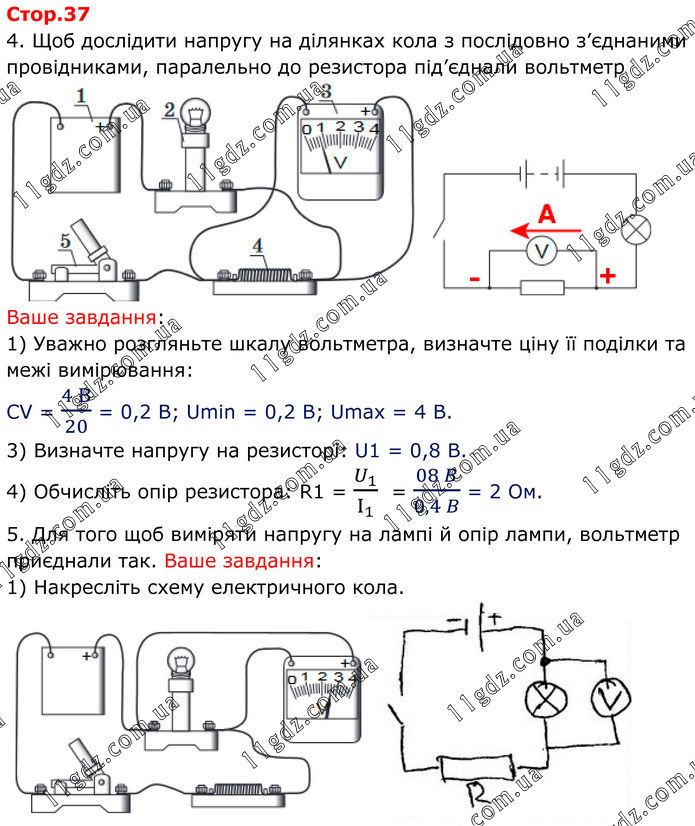 4. Щоб дослідити напругу на ділянках кола з послідовно з’єднаними провідниками, паралельно до резистора під’єднали вольтметр Ваше завдання: 1) Уважно розгляньте шкалу вольтметра, визначте ціну її поділки та межі вимірювання: CV = (4 B)/20 = 0,2 B; Umin = 0,2 B; Umax = 4 B. 3) Визначте напругу на резисторі: U1 = 0,8 B. 4) Обчисліть опір резистора: R1 = U_1/I_1 = (08 B)/(0,4 B) = 2 Ом. 5. Для того щоб виміряти напругу на лампі й опір лампи, вольтметр приєднали так. Ваше завдання: 1) Накресліть схему електричного кола.