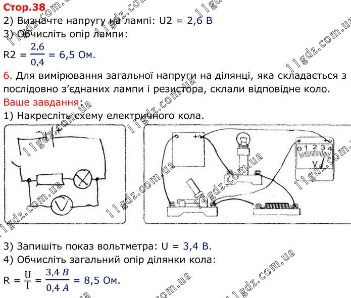 2) Визначте напругу на лампі: U2 = 2,6 B 3) Обчисліть опір лампи: R2 = 2,6/0,4 = 6,5 Ом. 6. Для вимірювання загальної напруги на ділянці, яка складається з послідовно з’єднаних лампи і резистора, склали відповідне коло. Ваше завдання: 1) Накресліть схему електричного кола. 3) Запишіть показ вольтметра: U = 3,4 B. 4) Обчисліть загальний опір ділянки кола: R = U/I = (3,4 B)/(0,4 A) = 8,5 Ом.