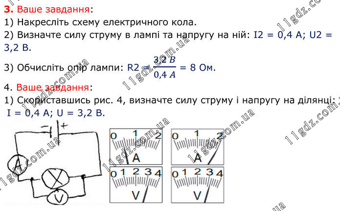 3. Ваше завдання: 1) Накресліть схему електричного кола. 2) Визначте силу струму в лампі та напругу на ній: І2 = 0,4 А; U2 = 3,2 B. 3) Обчисліть опір лампи: R2 = (3,2 B)/(0,4 A) = 8 Ом. 4. Ваше завдання: 1) Скориставшись рис. 4, визначте силу струму і напругу на ділянці: І = 0,4 А; U = 3,2 B.