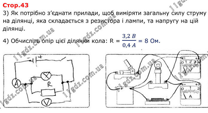 3) Як потрібно з’єднати прилади, щоб виміряти загальну силу струму на ділянці, яка складається з резистора і лампи, та напругу на цій ділянці. 4) Обчисліть опір цієї ділянки кола: R = (3,2 B)/(0,4 A) = 8 Ом.
