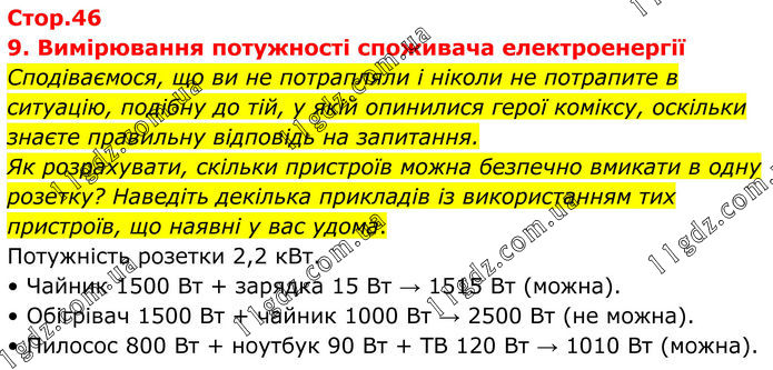 9. Вимірювання потужності споживача електроенергії Сподіваємося, що ви не потрапляли і ніколи не потрапите в ситуацію, подібну до тій, у якій опинилися герої коміксу, оскільки знаєте правильну відповідь на запитання. Як розрахувати, скільки пристроїв можна безпечно вмикати в одну розетку? Наведіть декілька прикладів із використанням тих пристроїв, що наявні у вас удома. Потужність розетки 2,2 кВт. • Чайник 1500 Вт + зарядка 15 Вт → 1515 Вт (можна). • Обігрівач 1500 Вт + чайник 1000 Вт → 2500 Вт (не можна). • Пилосос 800 Вт + ноутбук 90 Вт + ТВ 120 Вт → 1010 Вт (можна).