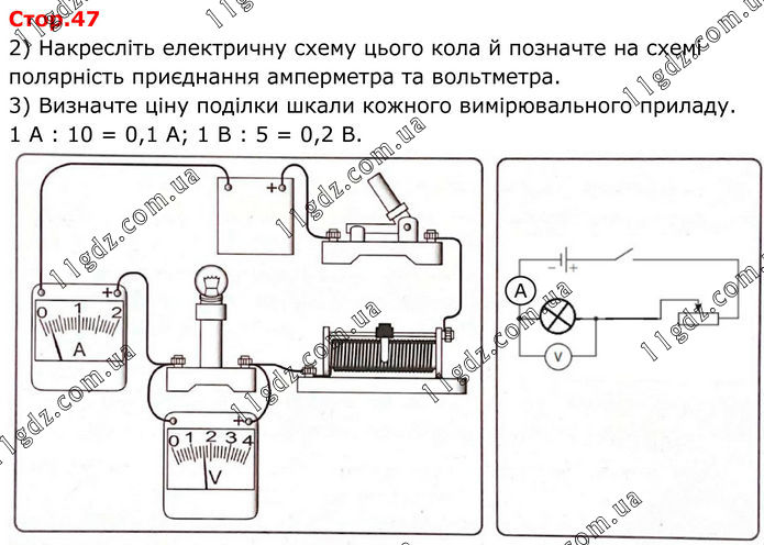 2) Накресліть електричну схему цього кола й позначте на схемі полярність приєднання амперметра та вольтметра. 3) Визначте ціну поділки шкали кожного вимірювального приладу. 1 А : 10 = 0,1 А; 1 В : 5 = 0,2 В.