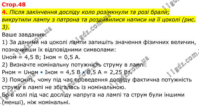 4. Після закінчення досліду коло розімкнули та розі брали; викрутили лампу з патрона та роздивилися написи на її цоколі (рис. 3). Ваше завдання: 1) За даними на цоколі лампи запишіть значення фізичних величин, позначивши їх відповідними символами: Uном = 4,5 В; Iном = 0,5 А. 2) Визначте номінальну потужність струму в лампі: Pном = Uном • Iном = 4,5 В • 0,5 А = 2,25 Вт. 3) Поясніть, чому під час проведення досліду фактична потужність струму в лампі не збігалась із номінальною. Бо в колі під час досліду напруга на лампі та струм були іншими (менші), ніж номінальні.