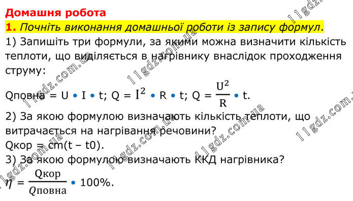 Домашня робота 1. Почніть виконання домашньої роботи із запису формул. 1) Запишіть три формули, за якими можна визначити кількість теплоти, що виділяється в нагрівнику внаслідок проходження струму: Qповна = U • I • t; Q = I^2 • R • t; Q = U^2/R • t. 2) За якою формулою визначають кількість теплоти, що витрачається на нагрівання речовини? Qкор = cm(t – t0). 3) За якою формулою визначають ККД нагрівника? η = Qкор/Qповна • 100%.