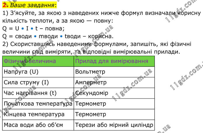 2. Ваше завдання: 1) З’ясуйте, за якою з наведених нижче формул визначали корисну кількість теплоти, а за якою — повну: Q = U • I • t – повна; Q = cводи • mводи • tводи – корисна. 2) Скориставшись наведеними формулами, запишіть, які фізичні величини слід виміряти, та відповідні вимірювальні прилади. Фізична величина Прилад для вимірювання Напруга (U) Вольтметр Сила струму (I) Амперметр Час нагрівання (t) Секундомір Початкова температура Термометр Кінцева температура Термометр Маса води або об’єм Терези або мірний циліндр