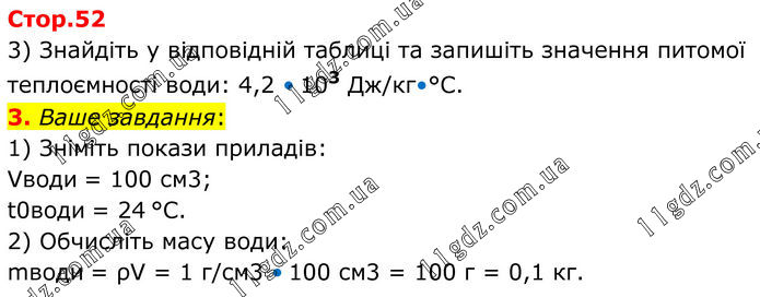 3) Знайдіть у відповідній таблиці та запишіть значення питомої теплоємності води: 4,2 • 103 Дж/кг•°C. 3. Ваше завдання: 1) Зніміть покази приладів: Vводи = 100 см3; t0води = 24 °C. 2) Обчисліть масу води: mводи = ρV = 1 г/см3 • 100 см3 = 100 г = 0,1 кг.
