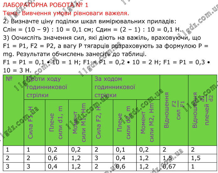 ЛАБОРАТОРНА РОБОТА № 1 Тема. Вивчення умови рівноваги важеля. 2. Визначте ціну поділки шкал вимірювальних приладів: Слін = (10 – 9) : 10 = 0,1 см; Сдин = (2 – 1) : 10 = 0,1 Н. 3) Оочисліть значення сил, які діють на важіль, враховуючи, що F1 = P1, F2 = P2, а вагу P тягарців розраховують за формулою P = mg. Результати обчислень занесіть до таблиці. F1 = P1 = 0,1 • 10 = 1 H; F1 = P1 = 0,2 • 10 = 2 H; F1 = P1 = 0,3 • 10 = 3 H.