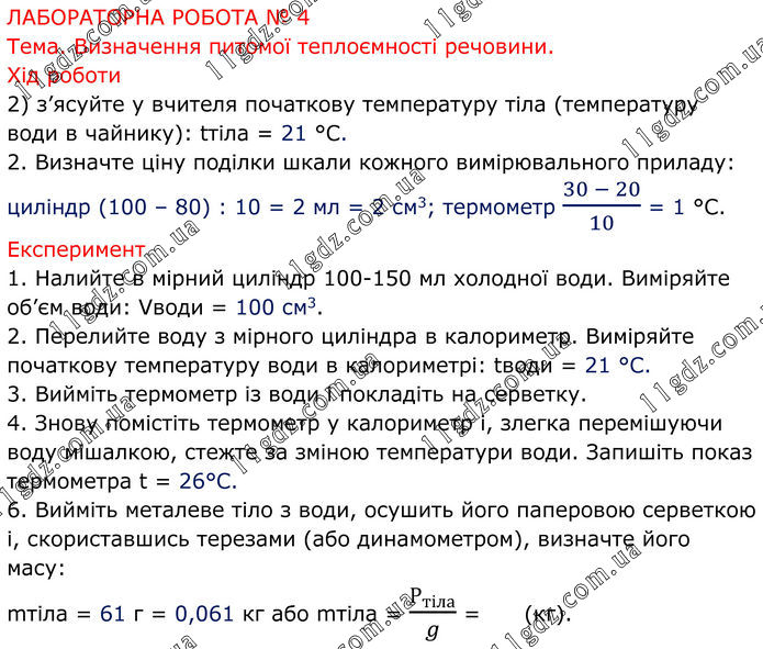 ЛАБОРАТОРНА РОБОТА № 4 Тема. Визначення питомої теплоємності речовини. Хід роботи 2) з’ясуйте у вчителя початкову температуру тіла (температуру води в чайнику): tтіла = 21 °С. 2. Визначте ціну поділки шкали кожного вимірювального приладу: циліндр (100 – 80) : 10 = 2 мл = 2 см3; термометр (30 - 20)/10 = 1 °С. Експеримент 1. Налийте в мірний циліндр 100-150 мл холодної води. Виміряйте об’єм води: Vводи = 100 см3. 2. Перелийте воду з мірного циліндра в калориметр. Виміряйте початкову температуру води в калориметрі: tводи = 21 °С. 3. Вийміть термометр із води і покладіть на серветку. 4. Знову помістіть термометр у калориметр і, злегка перемішуючи воду мішалкою, стежте за зміною температури води. Запишіть показ термометра t = 26°С. 6. Вийміть металеве тіло з води, осушить його паперовою серветкою і, скориставшись терезами (або динамометром), визначте його масу: mтіла = 61 г = 0,061 кг або mтіла = Р_тіла/g = (кг).