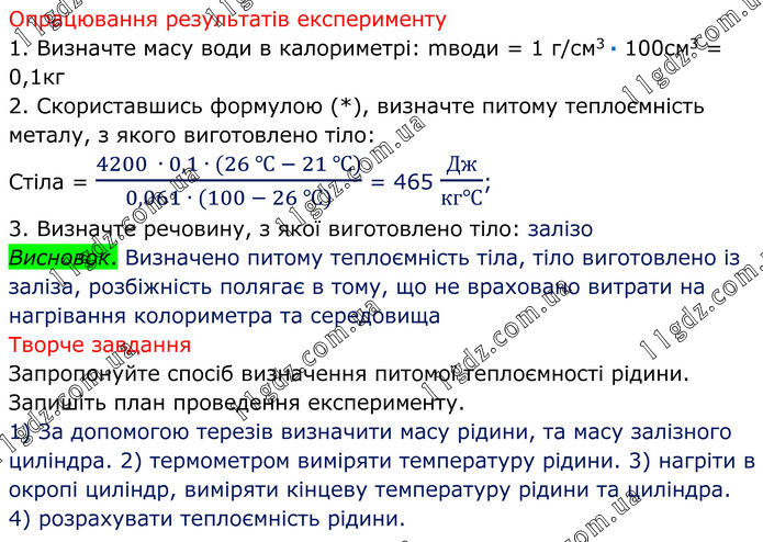 Опрацювання результатів експерименту 1. Визначте масу води в калориметрі: mводи = 1 г/см3 ∙ 100см3 = 0,1кг 2. Скориставшись формулою (*), визначте питому теплоємність металу, з якого виготовлено тіло: Стіла = (4200 ∙ 0,1 ∙ (26 ℃ - 21 ℃))/(0,061 ∙ (100 - 26 ℃)) = 465 Дж/(кг℃); 3. Визначте речовину, з якої виготовлено тіло: залізо Висновок. Визначено питому теплоємність тіла, тіло виготовлено із заліза, розбіжність полягає в тому, що не враховано витрати на нагрівання колориметра та середовища Творче завдання Запропонуйте спосіб визначення питомої теплоємності рідини. Запишіть план проведення експерименту. 1) За допомогою терезів визначити масу рідини, та масу залізного циліндра. 2) термометром виміряти температуру рідини. 3) нагріти в окропі циліндр, виміряти кінцеву температуру рідини та циліндра. 4) розрахувати теплоємність рідини.