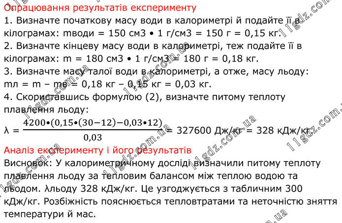 Опрацювання результатів експерименту 1. Визначте початкову масу води в калориметрі й подайте її в кілограмах: mводи = 150 см3 • 1 г/см3 = 150 г = 0,15 кг. 2. Визначте кінцеву масу води в калориметрі, теж подайте її в кілограмах: m = 180 см3 • 1 г/см3 = 180 г = 0,18 кг. 3. Визначте масу талої води в калориметрі, а отже, масу льоду: mл = m – mв = 0,18 кг – 0,15 кг = 0,03 кг. 4. Скориставшись формулою (2), визначте питому теплоту плавлення льоду: λ = (4200•(0,15•(30-12)-0,03•12))/0,03 = 327600 Дж/кг = 328 кДж/кг. Аналіз експерименту і його результатів Висновок: У калориметричному досліді визначили питому теплоту плавлення льоду за тепловим балансом між теплою водою та льодом. λльоду 328 кДж/кг. Це узгоджується з табличним 300 кДж/кг. Розбіжність пояснюється тепловтратами та неточністю зняття температури й мас.