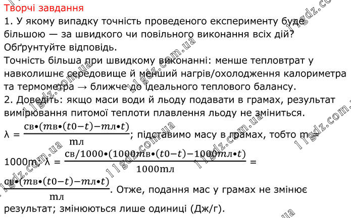 Творчі завдання 1. У якому випадку точність проведеного експерименту буде більшою — за швидкого чи повільного виконання всіх дій? Обґрунтуйте відповідь. Точність більша при швидкому виконанні: менше тепловтрат у навколишнє середовище й менший нагрів/охолодження калориметра та термометра → ближче до ідеального теплового балансу. 2. Доведіть: якщо маси води й льоду подавати в грамах, результат вимірювання питомої теплоти плавлення льоду не зміниться. λ = (cв•(mв•(t0-t)-mл•t))/mл; підставимо масу в грамах, тобто m = 1000m; λ = (cв/1000•(1000mв•(t0-t)-1000mл•t))/1000mл = (cв•(mв•(t0-t)-mл•t))/mл. Отже, подання мас у грамах не змінює результат; змінюються лише одиниці (Дж/г).