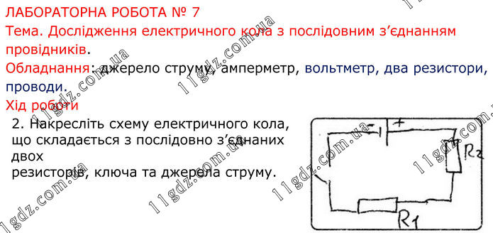 ЛАБОРАТОРНА РОБОТА № 7 Тема. Дослідження електричного кола з послідовним з’єднанням провідників. Обладнання: джерело струму, амперметр, вольтметр, два резистори, проводи. Хід роботи 2. Накресліть схему електричного кола, що складається з послідовно з’єднаних двох резисторів, ключа та джерела струму.