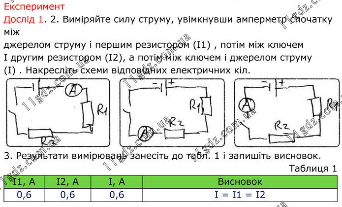Експеримент Дослід 1. 2. Виміряйте силу струму, увімкнувши амперметр спочатку між джерелом струму і першим резистором (І1) , потім між ключем І другим резистором (І2), а потім між ключем і джерелом струму (І) . Накресліть схеми відповідних електричних кіл. 3. Результати вимірювань занесіть до табл. 1 і запишіть висновок. Таблиця 1