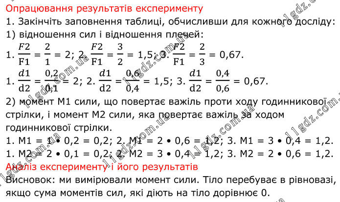 Опрацювання результатів експерименту 1. Закінчіть заповнення таблиці, обчисливши для кожного досліду: 1) відношення сил і відношення плечей: 1. F2/F1 = 2/1 = 2; 2. F2/F1 = 3/2 = 1,5; 3. F2/F1 = 2/3 = 0,67. 1. d1/d2 = 0,2/0,1 = 2; 2. d1/d2 = 0,6/0,4 = 1,5; 3. d1/d2 = 0,4/0,6 = 0,67. 2) момент M1 сили, що повертає важіль проти ходу годинникової стрілки, і момент M2 сили, яка повертає важіль за ходом годинникової стрілки. 1. М1 = 1 • 0,2 = 0,2; 2. М1 = 2 • 0,6 = 1,2; 3. М1 = 3 • 0,4 = 1,2. 1. М2 = 2 • 0,1 = 0,2; 2. М2 = 3 • 0,4 = 1,2; 3. М2 = 2 • 0,6 = 1,2. Аналіз експерименту і його результатів Висновок: ми вимірювали момент сили. Тіло перебуває в рівновазі, якщо сума моментів сил, які діють на тіло дорівнює 0.