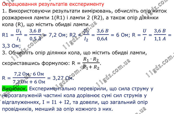 Опрацювання результатів експерименту 1. Використовуючи результати вимірювань, обчисліть опір ниток розжарення лампи 1(R1) і лампи 2 (R2), а також опір ділянки кола (R), що містить обидві лампи. R1 = U_1/I_1 = (3,6 B)/(0,5 A) = 7,2 Ом; R2 = U_2/I_2 = (3,6 B)/(0,6A ) = 6 Ом; R = U/I = (3,6 B)/(1,1 A) = 3,3 Ом; 3. Обчисліть опір ділянки кола, що містить обидві лампи, скориставшись формулою: R = (R_1 ∙ R_2)/(R_1+ R_2 ). R = (7,2 Ом ∙ 6 Ом)/(7,2 Ом + 6 Ом) = 3,27 Ом. Висновок. Експериментально перевірили, що сила струму у нерозгалуженій частині кола дорівнює сумі сил струмів у відгалуженнях, І = І1 + І2, та довели, що загальний опір провідників, менший за опір кожного з них.
