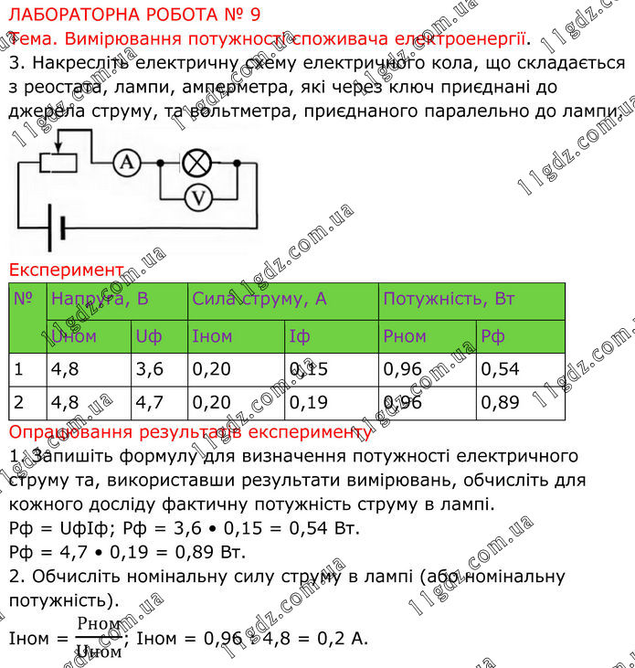 ЛАБОРАТОРНА РОБОТА № 9 Тема. Вимірювання потужності споживача електроенергії. 3. Накресліть електричну схему електричного кола, що складається з реостата, лампи, амперметра, які через ключ приєднані до джерела струму, та вольтметра, приєднаного паралельно до лампи. Експеримент Опрацювання результатів експерименту 1. Запишіть формулу для визначення потужності електричного струму та, використавши результати вимірювань, обчисліть для кожного досліду фактичну потужність струму в лампі. Рф = UфIф; Рф = 3,6 • 0,15 = 0,54 Вт. Рф = 4,7 • 0,19 = 0,89 Вт. 2. Обчисліть номінальну силу струму в лампі (або номінальну потужність). Іном = Рном/Uном; Іном = 0,96 : 4,8 = 0,2 А.