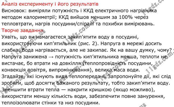Аналіз експерименту і його результатів Висновок: виміряли потужність і ККД електричного нагрівника методом калориметрії; ККД вийшов меншим за 100% через тепловтрати, нагрів посудини/спіралі та похибки вимірювань. Творче завдання Уявіть, що ви намагаєтеся закип’ятити воду в посудині, використовуючи кип’ятильник (рис. 2). Напруга в мережі досить слабка. Вода нагрівається, але не закипає. Як на вашу думку, чому? Напруга занижена → потужність кип’ятильника менша, теплоти не вистачає, бо втрати на довкілля (теплопровідність посудини, конвекція повітря, випромінювання), велика маса води. Згадайте, які існують види теплопередачі. Запропонуйте дії, які слід зробити, щоб досягти бажаного результату, тобто закип’ятити воду. Зменшити втрати тепла — накрити кришкою (якщо можливо), використати меншу кількість води, забезпечити повне занурення, теплоізолювати стінки та низ посудини.