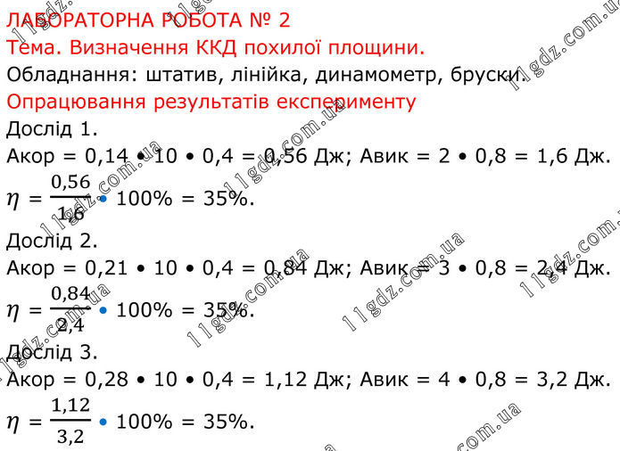 ЛАБОРАТОРНА РОБОТА № 2 Тема. Визначення ККД похилої площини. Обладнання: штатив, лінійка, динамометр, бруски. Опрацювання результатів експерименту Дослід 1. Акор = 0,14 • 10 • 0,4 = 0,56 Дж; Авик = 2 • 0,8 = 1,6 Дж. η = 0,56/1,6 • 100% = 35%. Дослід 2. Акор = 0,21 • 10 • 0,4 = 0,84 Дж; Авик = 3 • 0,8 = 2,4 Дж. η = 0,84/2,4 • 100% = 35%. Дослід 3. Акор = 0,28 • 10 • 0,4 = 1,12 Дж; Авик = 4 • 0,8 = 3,2 Дж. η = 1,12/3,2 • 100% = 35%.