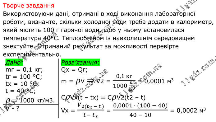 Творче завдання Використовуючи дані, отримані в ході виконання лабораторної роботи, визначте, скільки холодної води треба додати в калориметр, який містить 100 г гарячої води, щоб у ньому встановилася температура 40°С. Теплообміном із навколишнім середовищем знехтуйте. Отриманий результат за можливості перевірте експериментально. Дано: mг = 0,1 кг; tг = 100 °С; tх = 10 °С; t = 40 °С; ρ = 1000 кг/м3. Розв’язання: Qх = Qг; m = ρV ⇒ V2 = (0,1 кг)/(1000 кг/м^3 ) = 0,0001 м3 СρVx(t – tx) = CρV2(t2 – t) Vx = V_(2(t_2 - t ))/(t- t_x ) = (0,0001 ∙ (100 - 40))/(40 - 10) = 0,0002 м3