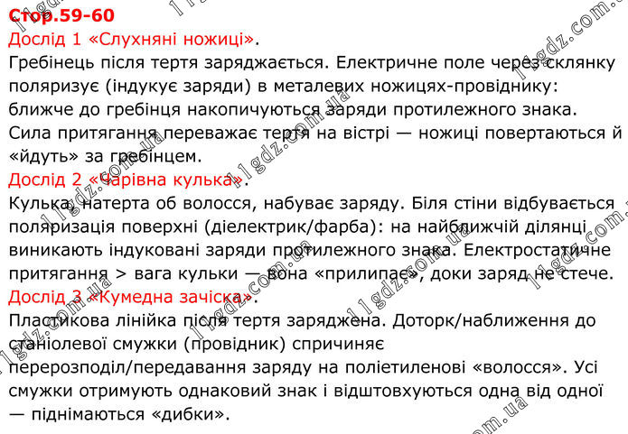 Дослід 1 «Слухняні ножиці». Гребінець після тертя заряджається. Електричне поле через склянку поляризує (індукує заряди) в металевих ножицях-провіднику: ближче до гребінця накопичуються заряди протилежного знака. Сила притягання переважає тертя на вістрі — ножиці повертаються й «йдуть» за гребінцем. Дослід 2 «Чарівна кулька». Кулька, натерта об волосся, набуває заряду. Біля стіни відбувається поляризація поверхні (діелектрик/фарба): на найближчій ділянці виникають індуковані заряди протилежного знака. Електростатичне притягання > вага кульки — вона «прилипає», доки заряд не стече. Дослід 3 «Кумедна зачіска». Пластикова лінійка після тертя заряджена. Доторк/наближення до станіолевої смужки (провідник) спричиняє перерозподіл/передавання заряду на поліетиленові «волосся». Усі смужки отримують однаковий знак і відштовхуються одна від одної — піднімаються «дибки».