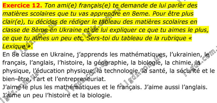 Exercice 12. Ton ami(e) français(e) te demande de lui parler des matières scolaires que tu vas apprendre en 8eme. Pour être plus clair(e), tu décides de rédiger le tableau des matières scolaires en classe de 8ème en Ukraine et de lui expliquer ce que tu aimes le plus, ce que tu aimes un peu etc. Sers-toi du tableau de la rubrique « Lexique ». En 8e classe en Ukraine, j’apprends les mathématiques, l’ukrainien, le français, l’anglais, l’histoire, la géographie, la biologie, la chimie, la physique, l’éducation physique, la technologie, la santé, la sécurité et le bien-être, l’art et l’entrepreneuriat. J’aime le plus les mathématiques et le français. J’aime aussi l’anglais. J’aime un peu l’histoire et la biologie.