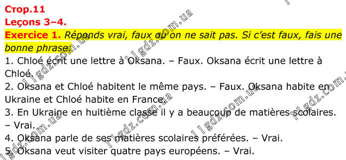 Leçons 3–4. Exercice 1. Réponds vrai, faux ou on ne sait pas. Si c’est faux, fais une bonne phrase. 1. Chloé écrit une lettre à Oksana. – Faux. Oksana écrit une lettre à Chloé. 2. Oksana et Chloé habitent le même pays. – Faux. Oksana habite en Ukraine et Chloé habite en France. 3. En Ukraine en huitième classe il y a beaucoup de matières scolaires. – Vrai. 4. Oksana parle de ses matières scolaires préférées. – Vrai. 5. Oksana veut visiter quatre pays européens. – Vrai.