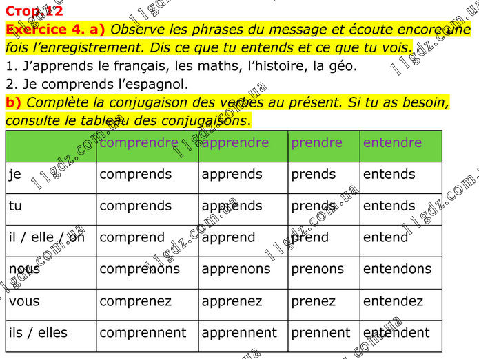 Exercice 4. a) Observe les phrases du message et écoute encore une fois l’enregistrement. Dis ce que tu entends et ce que tu vois. 1. J’apprends le français, les maths, l’histoire, la géo. 2. Je comprends l’espagnol. b) Complète la conjugaison des verbes au présent. Si tu as besoin, consulte le tableau des conjugaisons.