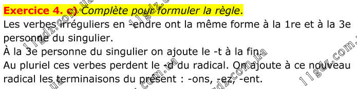 Exercice 4. c) Complète pour formuler la règle. Les verbes irréguliers en -endre ont la même forme à la 1re et à la 3e personne du singulier. À la 3e personne du singulier on ajoute le -t à la fin. Au pluriel ces verbes perdent le -d du radical. On ajoute à ce nouveau radical les terminaisons du présent : -ons, -ez, -ent.