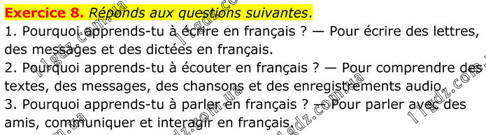 Exercice 8. Réponds aux questions suivantes. 1. Pourquoi apprends-tu à écrire en français ? — Pour écrire des lettres, des messages et des dictées en français. 2. Pourquoi apprends-tu à écouter en français ? — Pour comprendre des textes, des messages, des chansons et des enregistrements audio. 3. Pourquoi apprends-tu à parler en français ? — Pour parler avec des amis, communiquer et interagir en français.
