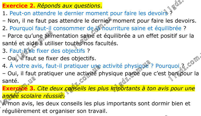 Exercice 2. Réponds aux questions. 1. Peut-on attendre le dernier moment pour faire les devoirs ? – Non, il ne faut pas attendre le dernier moment pour faire les devoirs. 2. Pourquoi faut-il consommer de la nourriture saine et équilibrée ? – Parce qu’une alimentation saine et équilibrée a un effet positif sur la santé et aide à utiliser toutes nos facultés. 3. Faut-il se fixer des objectifs ? – Oui, il faut se fixer des objectifs. 4. À votre avis, faut-il pratiquer une activité physique ? Pourquoi ? – Oui, il faut pratiquer une activité physique parce que c’est bon pour la santé. Exercice 3. Cite deux conseils les plus importants à ton avis pour une année scolaire réussie. À mon avis, les deux conseils les plus importants sont dormir bien et régulièrement et organiser son travail.