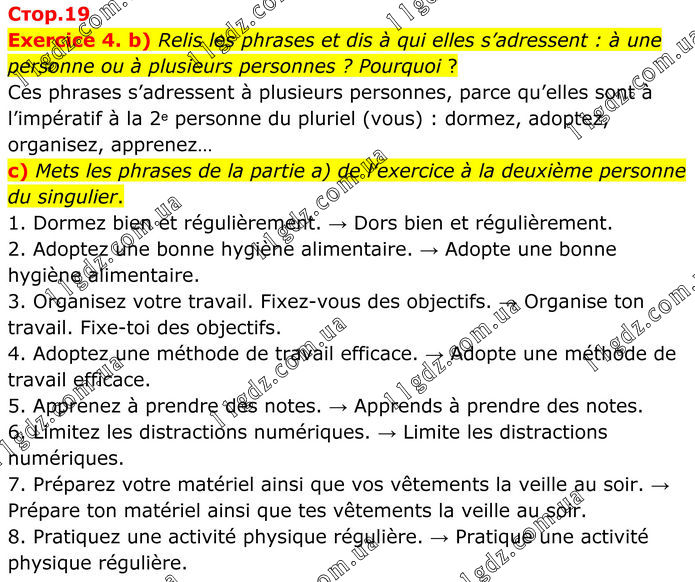 Exercice 4. b) Relis les phrases et dis à qui elles s’adressent : à une personne ou à plusieurs personnes ? Pourquoi ? Ces phrases s’adressent à plusieurs personnes, parce qu’elles sont à l’impératif à la 2ᵉ personne du pluriel (vous) : dormez, adoptez, organisez, apprenez… c) Mets les phrases de la partie a) de l’exercice à la deuxième personne du singulier. 1. Dormez bien et régulièrement. → Dors bien et régulièrement. 2. Adoptez une bonne hygiène alimentaire. → Adopte une bonne hygiène alimentaire. 3. Organisez votre travail. Fixez-vous des objectifs. → Organise ton travail. Fixe-toi des objectifs. 4. Adoptez une méthode de travail efficace. → Adopte une méthode de travail efficace. 5. Apprenez à prendre des notes. → Apprends à prendre des notes. 6. Limitez les distractions numériques. → Limite les distractions numériques. 7. Préparez votre matériel ainsi que vos vêtements la veille au soir. → Prépare ton matériel ainsi que tes vêtements la veille au soir. 8. Pratiquez une activité physique régulière. → Pratique une activité physique régulière.