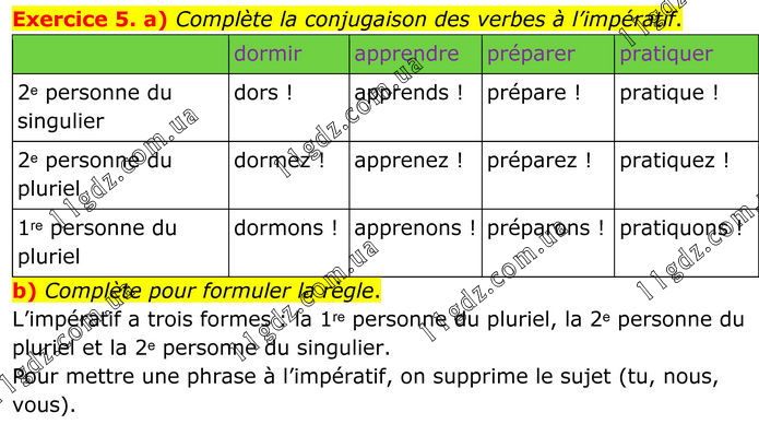 Exercice 5. a) Complète la conjugaison des verbes à l’impératif. dormir apprendre préparer pratiquer 2ᵉ personne du singulier dors ! apprends ! prépare ! pratique ! 2ᵉ personne du pluriel dormez ! apprenez ! préparez ! pratiquez ! 1ʳᵉ personne du pluriel dormons ! apprenons ! préparons ! pratiquons ! b) Complète pour formuler la règle. L’impératif a trois formes : la 1ʳᵉ personne du pluriel, la 2ᵉ personne du pluriel et la 2ᵉ personne du singulier. Pour mettre une phrase à l’impératif, on supprime le sujet (tu, nous, vous).