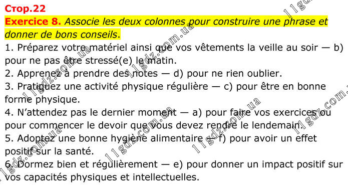 Exercice 8. Associe les deux colonnes pour construire une phrase et donner de bons conseils. 1. Préparez votre matériel ainsi que vos vêtements la veille au soir — b) pour ne pas être stressé(e) le matin. 2. Apprenez à prendre des notes — d) pour ne rien oublier. 3. Pratiquez une activité physique régulière — c) pour être en bonne forme physique. 4. N’attendez pas le dernier moment — a) pour faire vos exercices ou pour commencer le devoir que vous devez rendre le lendemain. 5. Adoptez une bonne hygiène alimentaire — f) pour avoir un effet positif sur la santé. 6. Dormez bien et régulièrement — e) pour donner un impact positif sur vos capacités physiques et intellectuelles.