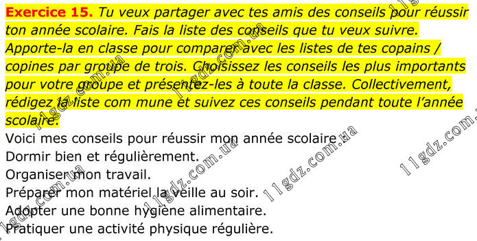 Exercice 15. Tu veux partager avec tes amis des conseils pour réussir ton année scolaire. Fais la liste des conseils que tu veux suivre. Apporte-la en classe pour comparer avec les listes de tes copains / copines par groupe de trois. Choisissez les conseils les plus importants pour votre groupe et présentez-les à toute la classe. Collectivement, rédigez la liste com mune et suivez ces conseils pendant toute l’année scolaire. Voici mes conseils pour réussir mon année scolaire : Dormir bien et régulièrement. Organiser mon travail. Préparer mon matériel la veille au soir. Adopter une bonne hygiène alimentaire. Pratiquer une activité physique régulière.