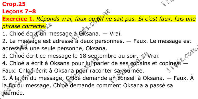 Leçons 7–8 Exercice 1. Réponds vrai, faux ou on ne sait pas. Si c’est faux, fais une phrase correcte. 1. Chloé écrit un message à Oksana. — Vrai. 2. Le message est adressé à deux personnes. — Faux. Le message est adressé à une seule personne, Oksana. 3. Chloé écrit ce message le 18 septembre au soir. — Vrai. 4. Chloé a écrit à Oksana pour lui parler de ses copains et copines. — Faux. Chloé écrit à Oksana pour raconter sa journée. 5. À la fin du message, Chloé demande un conseil à Oksana. — Faux. À la fin du message, Chloé demande comment Oksana a passé sa journée.
