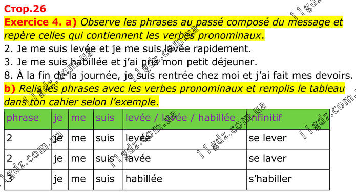 Exercice 4. a) Observe les phrases au passé composé du message et repère celles qui contiennent les verbes pronominaux. 2. Je me suis levée et je me suis lavée rapidement. 3. Je me suis habillée et j’ai pris mon petit déjeuner. 8. À la fin de la journée, je suis rentrée chez moi et j’ai fait mes devoirs. b) Relis les phrases avec les verbes pronominaux et remplis le tableau dans ton cahier selon l’exemple.