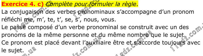 Exercice 4. c) Complète pour formuler la règle. La conjugaison des verbes pronominaux s’accompagne d’un pronom réfléchi me, m’, te, t’, se, s’, nous, vous. Le passé composé d’un verbe pronominal se construit avec un des pronoms de la même personne et du même nombre que le sujet. Ce pronom est placé devant l’auxiliaire être et s’accorde toujours avec le sujet.