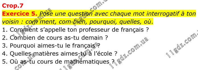 Exercice 5. Pose une question avec chaque mot interrogatif à ton voisin : com ment, com bien, pourquoi, quelles, où. 1. Comment s’appelle ton professeur de français ? 2. Combien de cours as-tu demain ? 3. Pourquoi aimes-tu le français ? 4. Quelles matières aimes-tu à l’école ? 5. Où as-tu cours de mathématiques ?