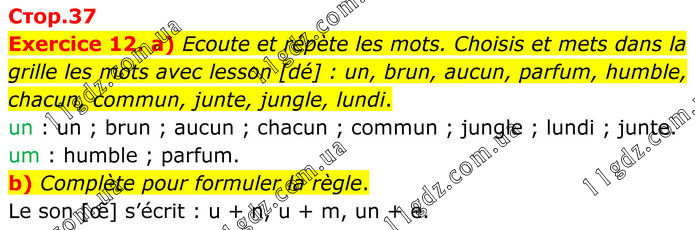 Exercice 12. a) Ecoute et répète les mots. Choisis et mets dans la grille les mots avec lesson [dé] : un, brun, aucun, parfum, humble, chacun, commun, junte, jungle, lundi. un : un ; brun ; aucun ; chacun ; commun ; jungle ; lundi ; junte. um : humble ; parfum. b) Complète pour formuler la règle. Le son [œ̃] s’écrit : u + n, u + m, un + e.