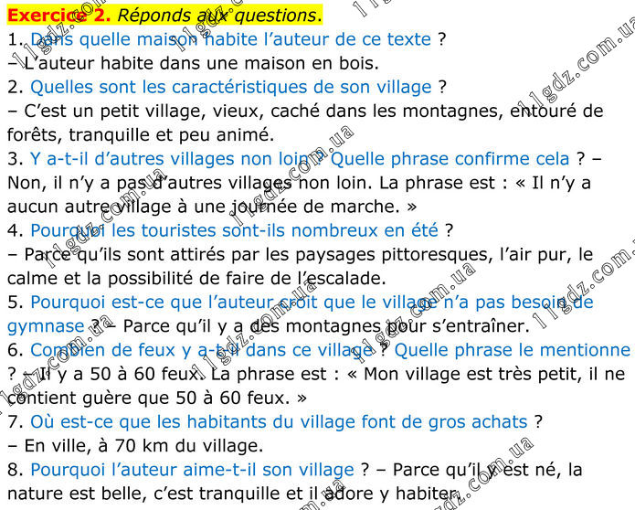 Exercice 2. Réponds aux questions. 1. Dans quelle maison habite l’auteur de ce texte ? – L’auteur habite dans une maison en bois. 2. Quelles sont les caractéristiques de son village ? – C’est un petit village, vieux, caché dans les montagnes, entouré de forêts, tranquille et peu animé. 3. Y a-t-il d’autres villages non loin ? Quelle phrase confirme cela ? – Non, il n’y a pas d’autres villages non loin. La phrase est : « Il n’y a aucun autre village à une journée de marche. » 4. Pourquoi les touristes sont-ils nombreux en été ? – Parce qu’ils sont attirés par les paysages pittoresques, l’air pur, le calme et la possibilité de faire de l’escalade. 5. Pourquoi est-ce que l’auteur croit que le village n’a pas besoin de gymnase ? – Parce qu’il y a des montagnes pour s’entraîner. 6. Combien de feux y a-t-il dans ce village ? Quelle phrase le mentionne ? – Il y a 50 à 60 feux. La phrase est : « Mon village est très petit, il ne contient guère que 50 à 60 feux. » 7. Où est-ce que les habitants du village font de gros achats ? – En ville, à 70 km du village. 8. Pourquoi l’auteur aime-t-il son village ? – Parce qu’il y est né, la nature est belle, c’est tranquille et il adore y habiter.